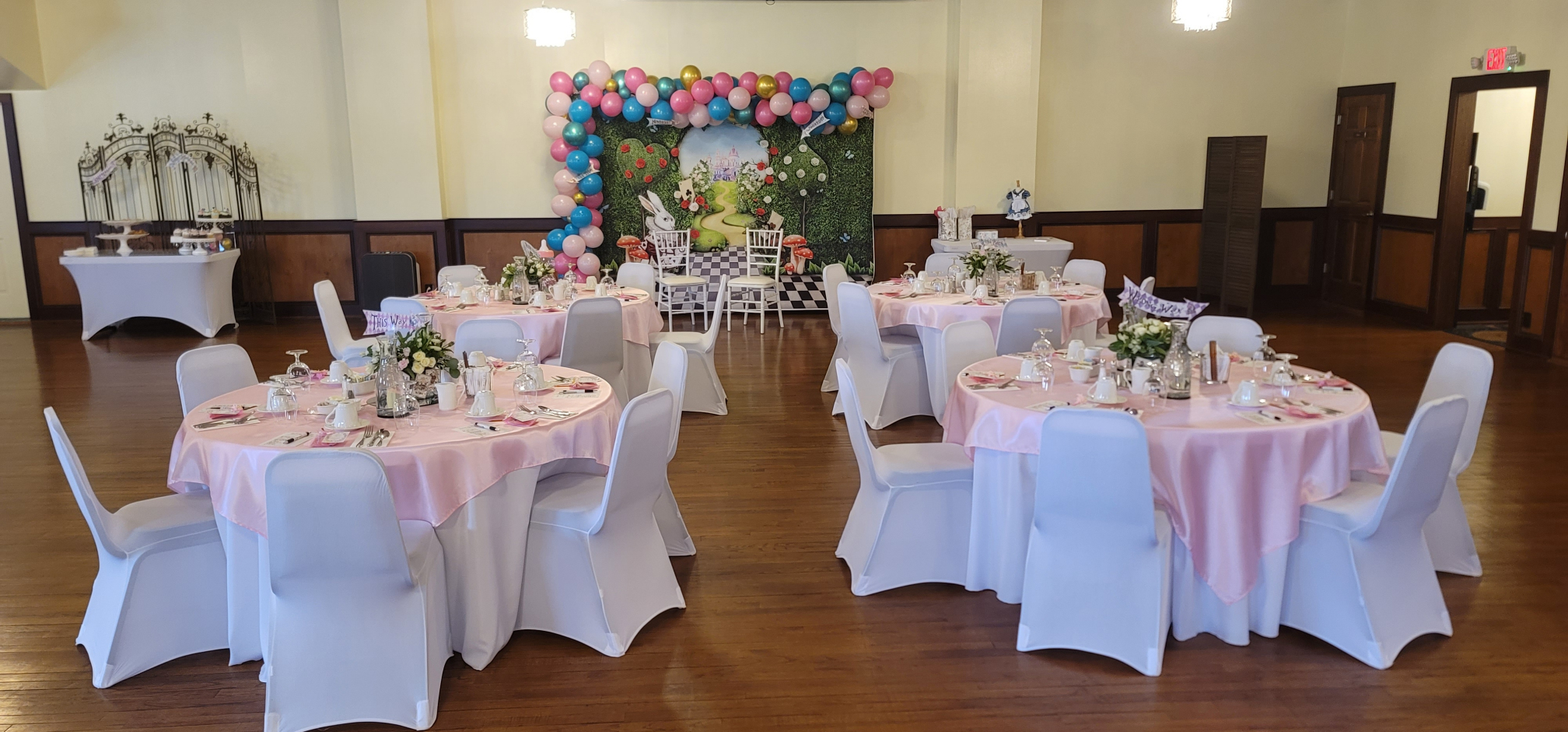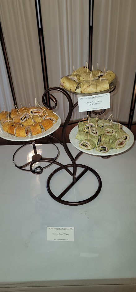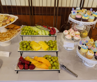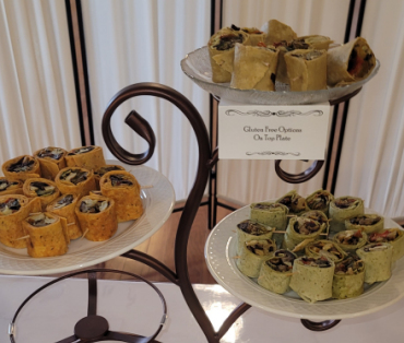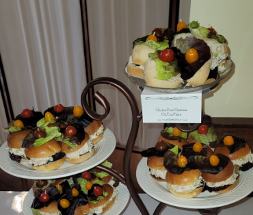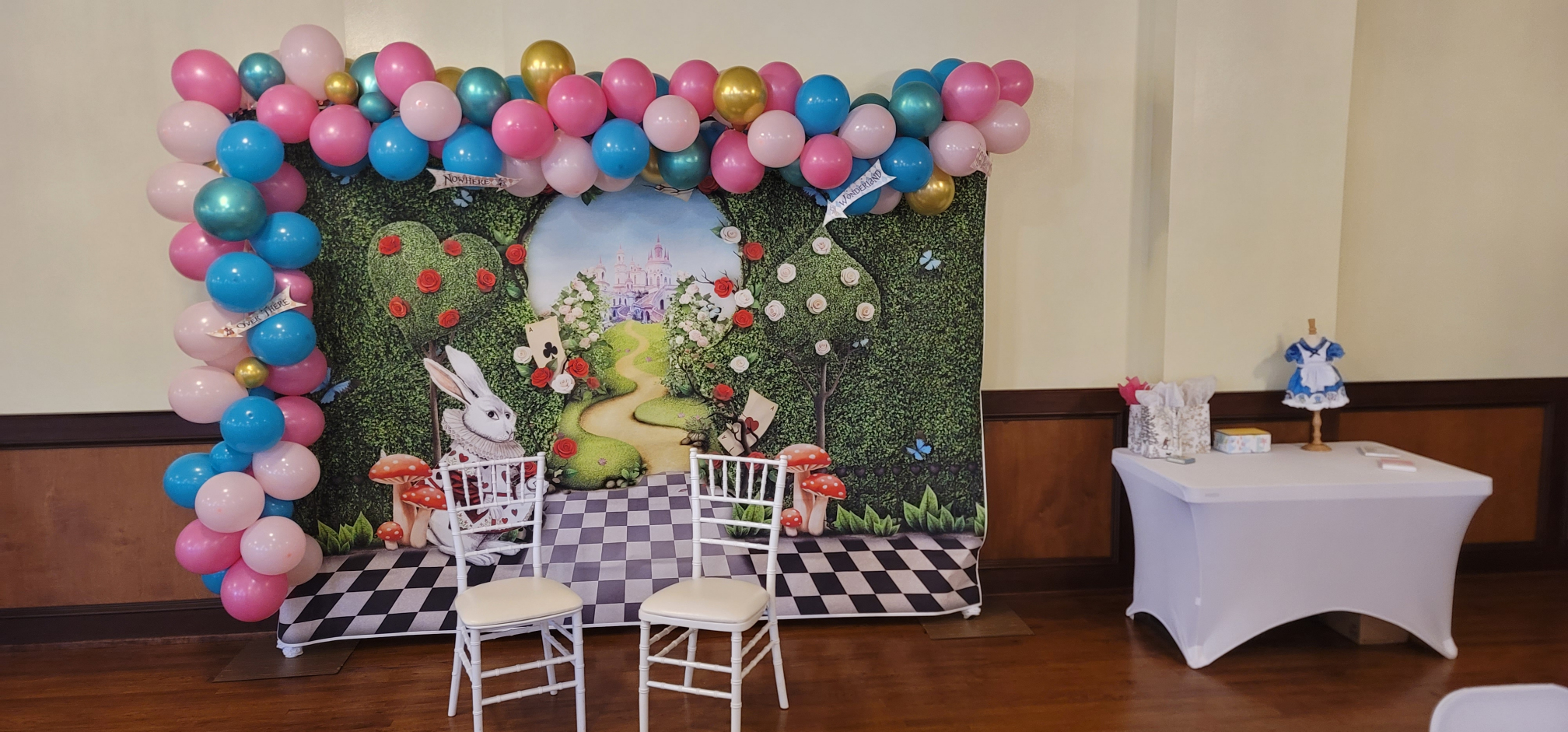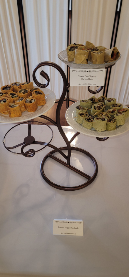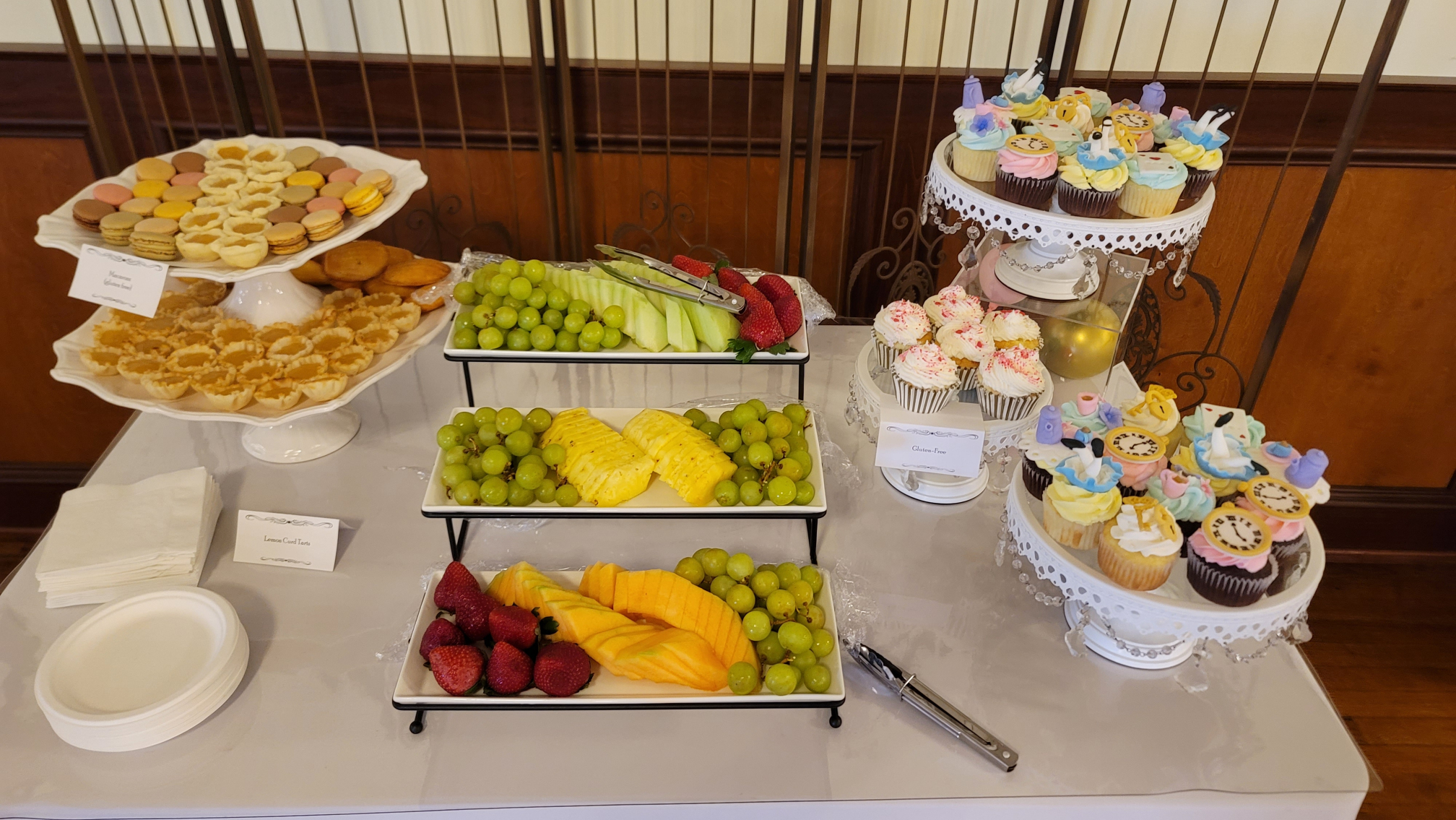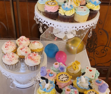 Their tea party had a variety of sweet and savory selections. Roasted Veggie Pinwheels, Smokey-Sweet Wraps, Chicken Salad Sandwiches (on mini buns from Spring Street Bakery), Mini Quiches, Spinach Bites, Chocolate Chip Scones, and Blueberry Lemon Scones. For dessert, they had Macarons, Lemon Curd Tarts, and a Fruit Display. The Alice in Wonderland-themed cupcakes were baked by Dana Rosini, and the centerpieces were from Pretty Petals.