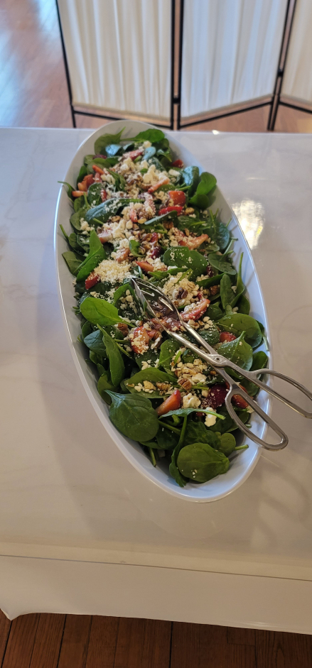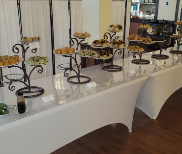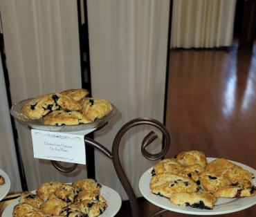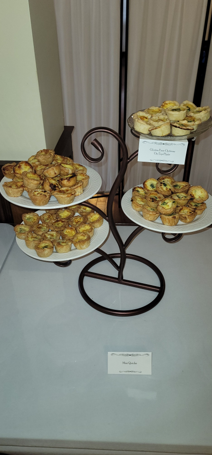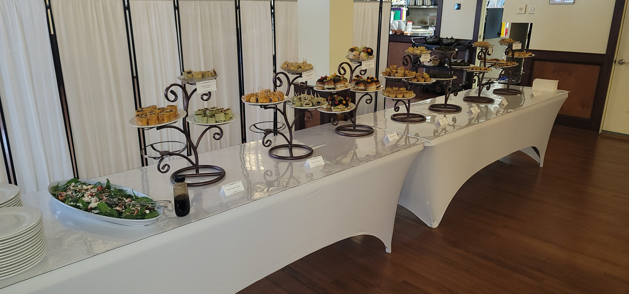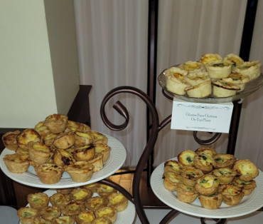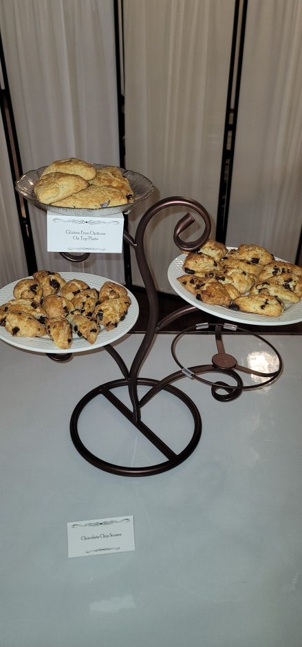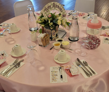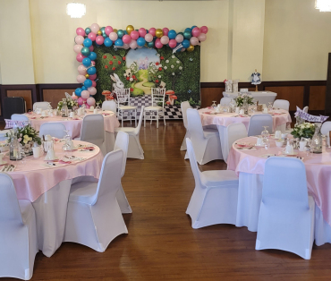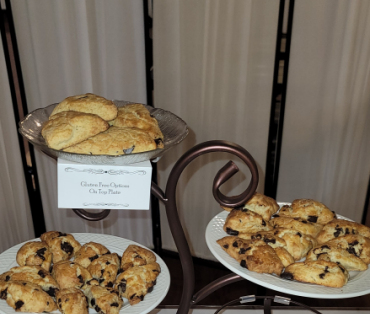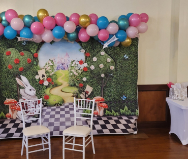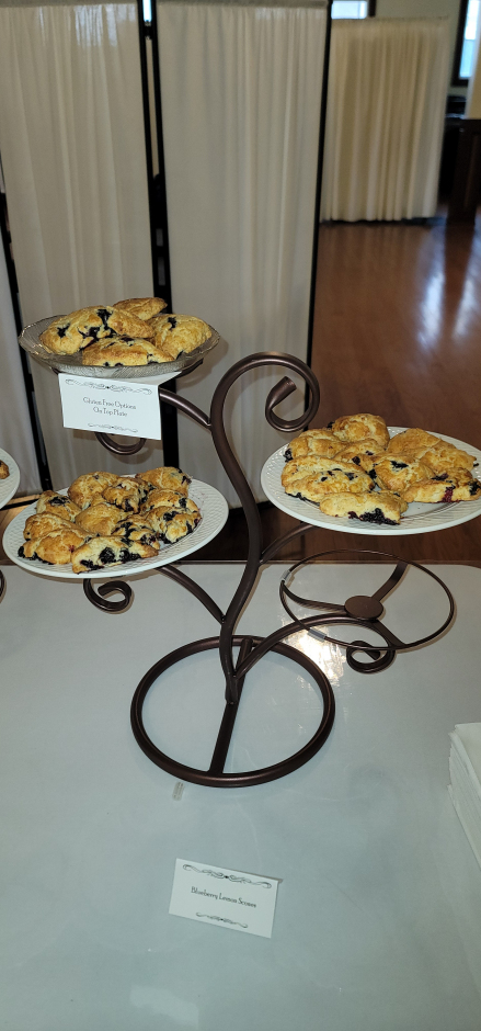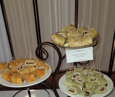Their tea party had a variety of sweet and savory selections. Roasted Veggie Pinwheels, Smokey-Sweet Wraps, Chicken Salad Sandwiches (on mini buns from Spring Street Bakery), Mini Quiches, Spinach Bites, Chocolate Chip Scones, and Blueberry Lemon Scones. For dessert, they had Macarons, Lemon Curd Tarts, and a Fruit Display. The Alice in Wonderland-themed cupcakes were baked by Dana Rosini, and the centerpieces were from Pretty Petals.
