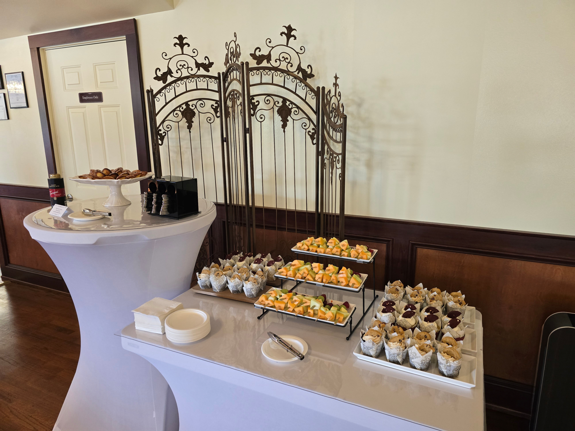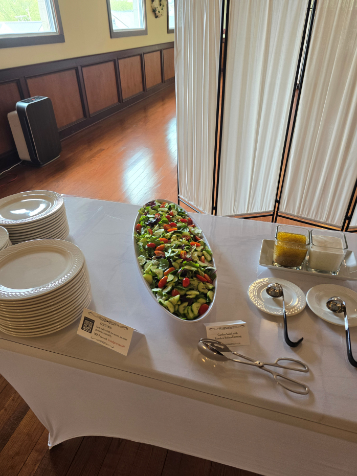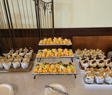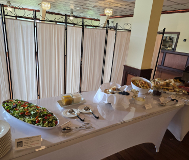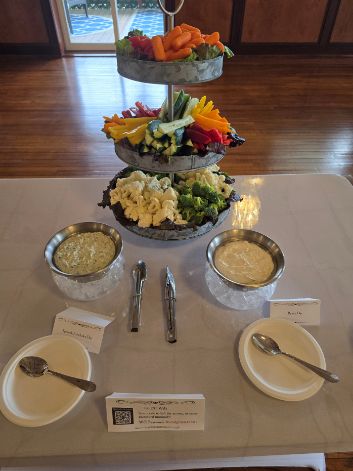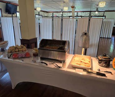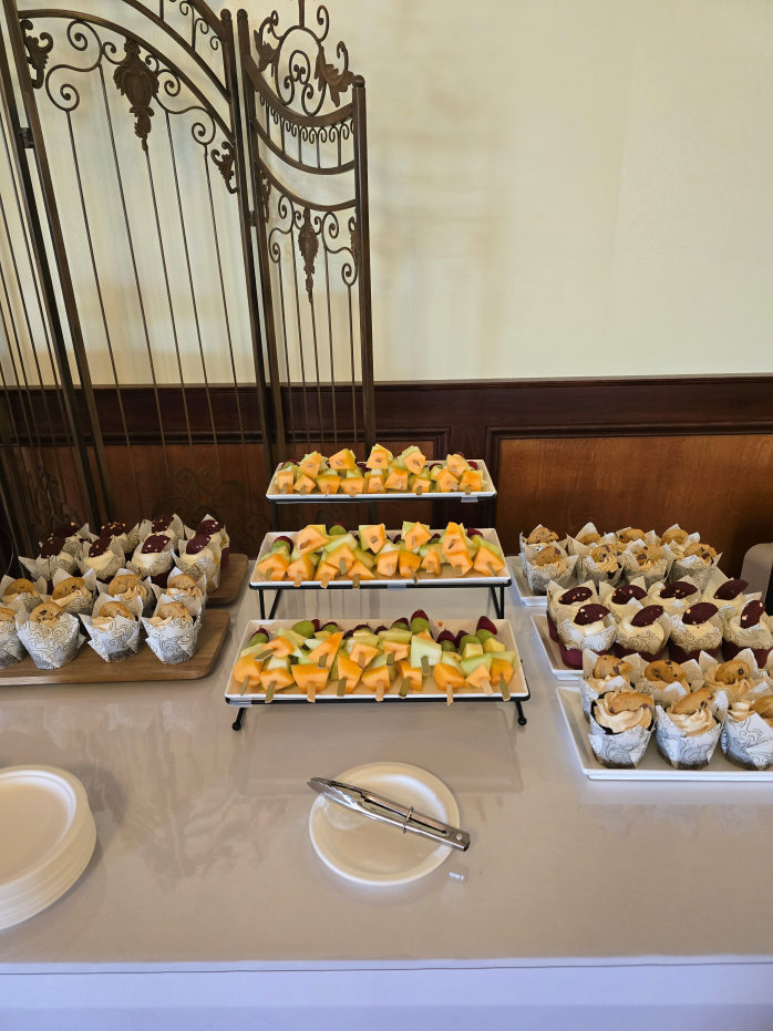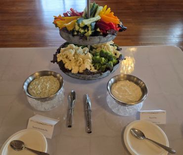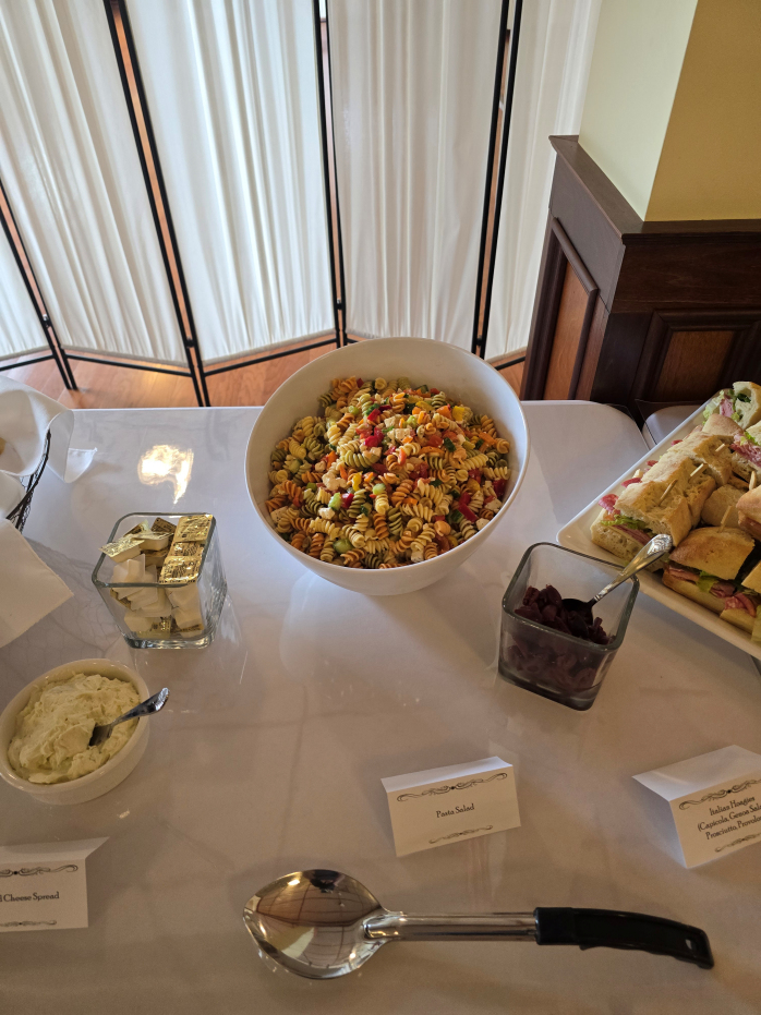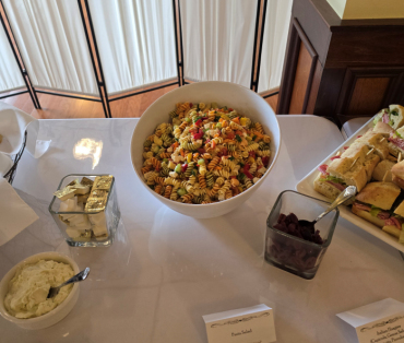 Her shower started with Bountiful vegetable display Ranch/Spinach Artichoke Dip. For dinner, they had a Garden Salad with Ranch & Italian dressings, Greek Pasta Salad, Mini Italian Subs on Ciabatta, Penne Marinara, and Chicken Tenders. For dessert, we set out a Fruit Display with Home Made Madeleines and Chocolate Sauce. They picked a Red Sangria for their signature drink.