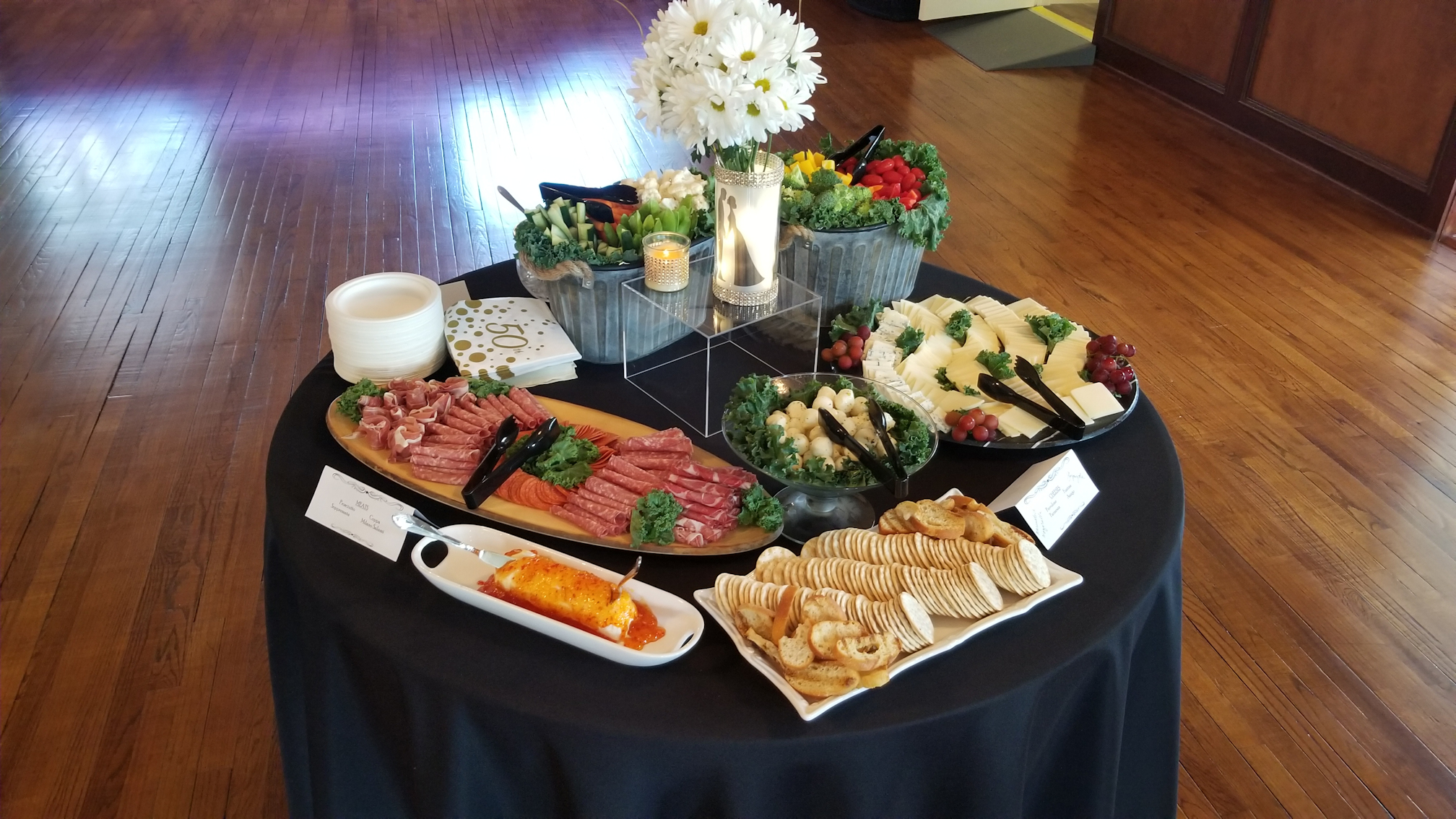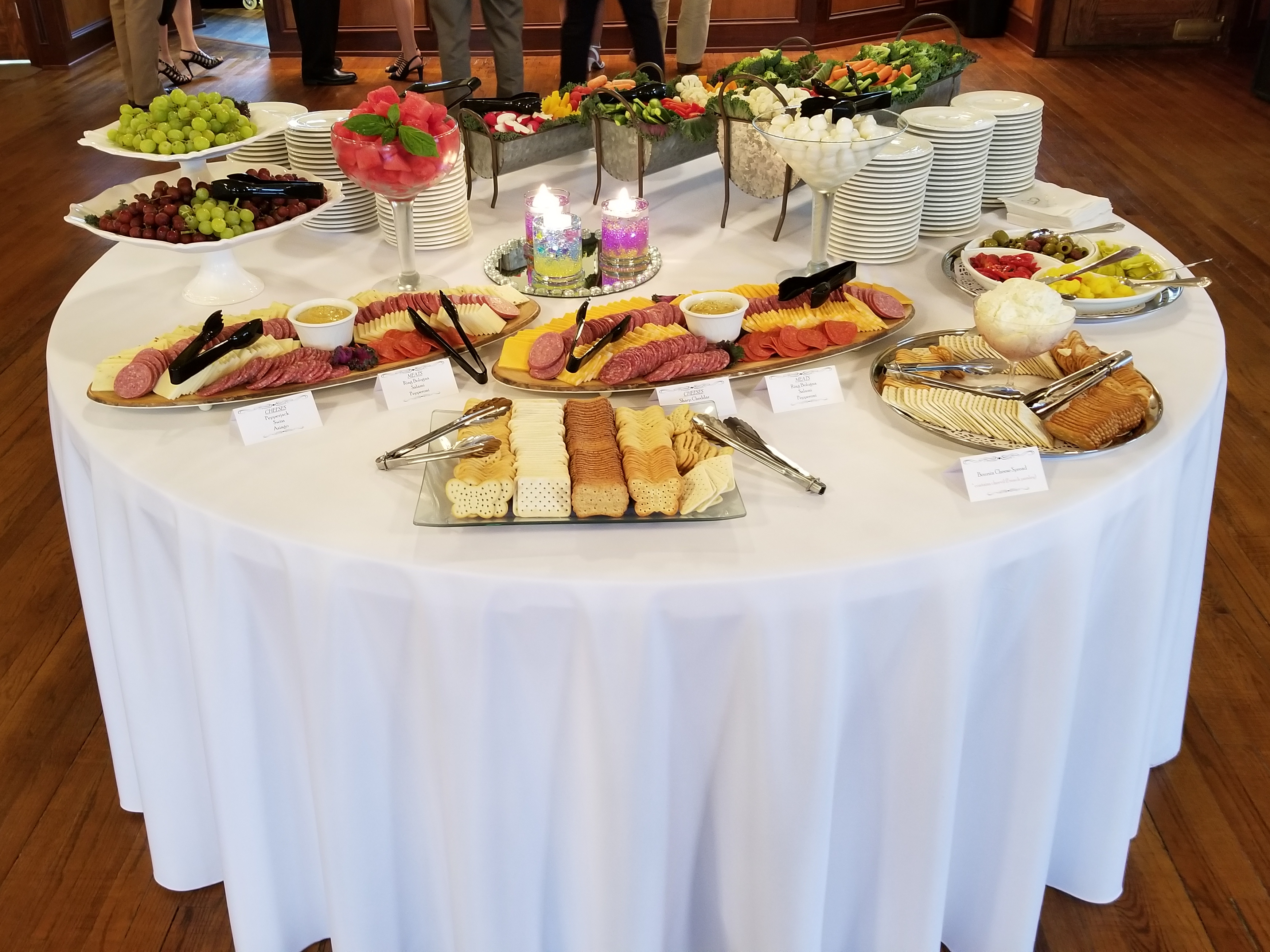 Meat & Cheese trays with crackers, herb cheese spread, olives, roasted peppers, pickled cauliflower, pepperoncini, grapes, and watermelon.