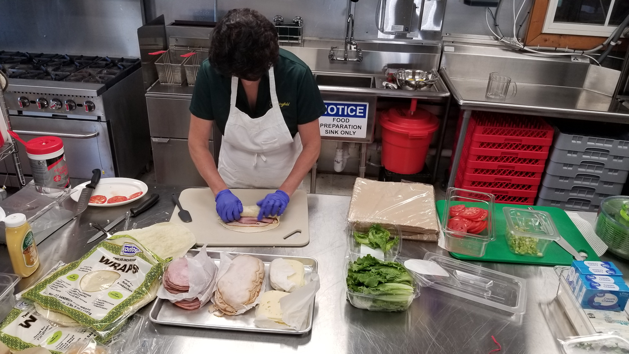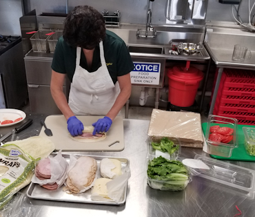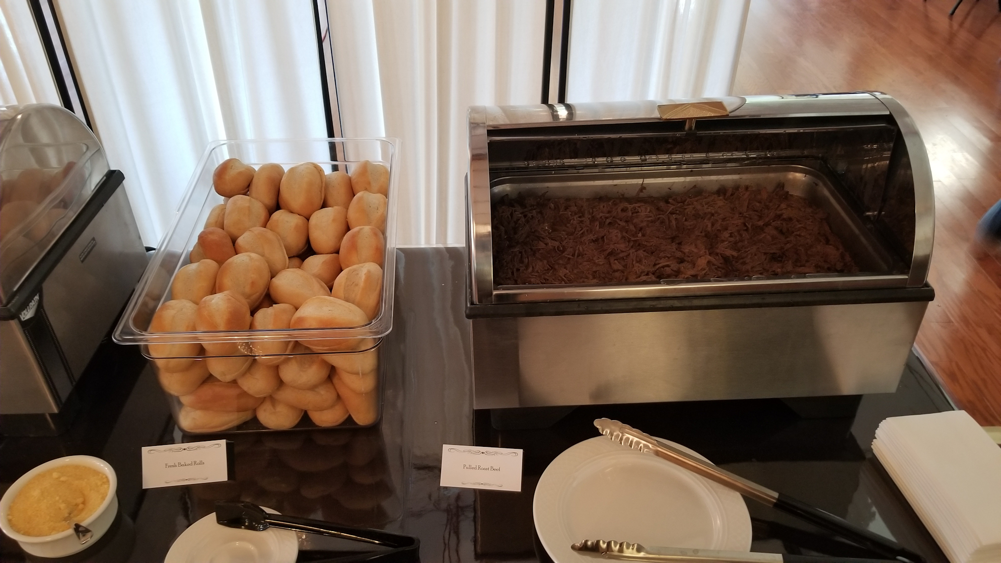 Garden salad with avacado & peppers; jerk chicken sliders; mini-rolls: pretzel, multi-grain, and herb-crusted.