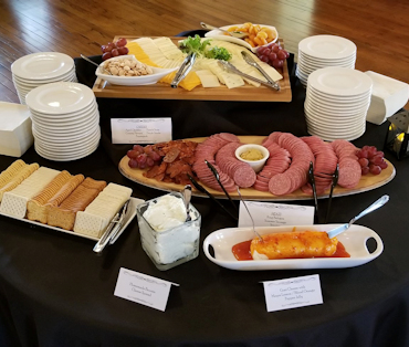 Meat & cheese trays with crackers, herb cheese spread, and goat cheese with warmed hot pepper jelly.