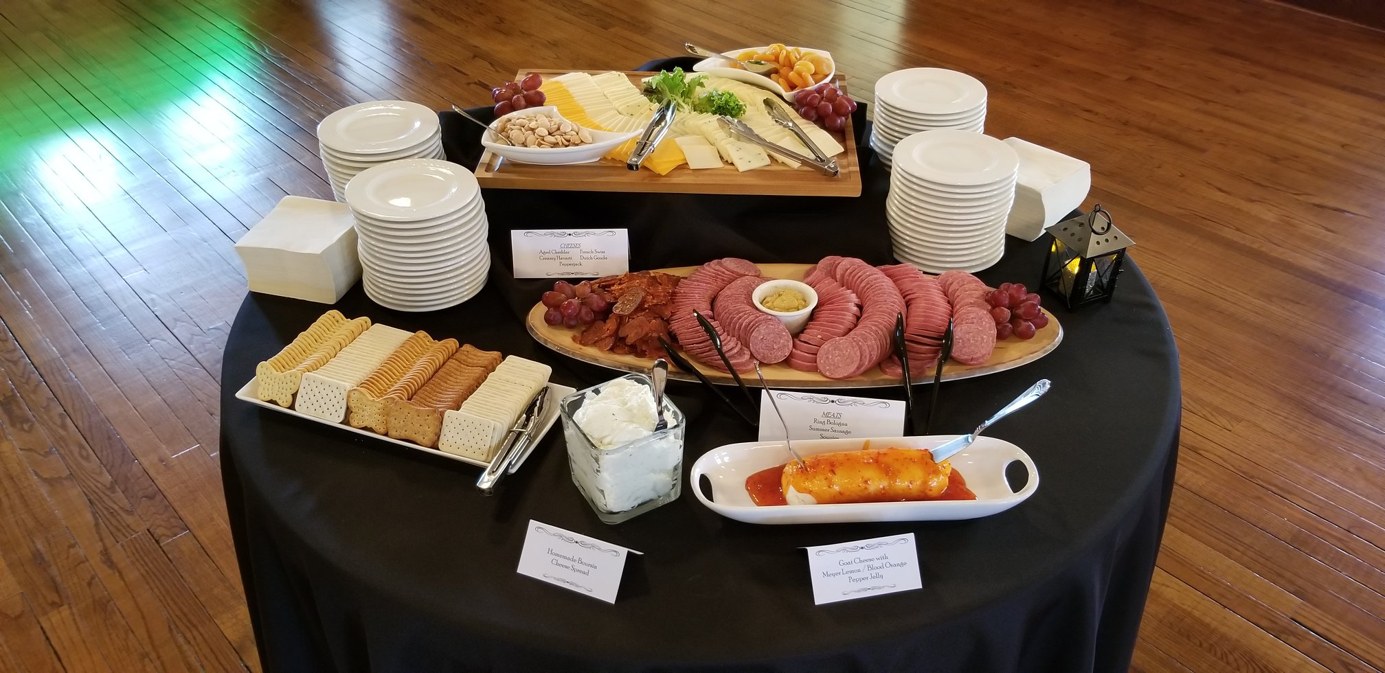 Meat & cheese trays with crackers, mozzarella balls, and goat cheese with warmed hot pepper jelly.