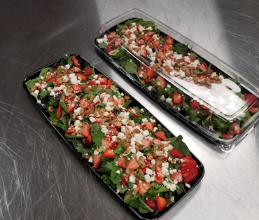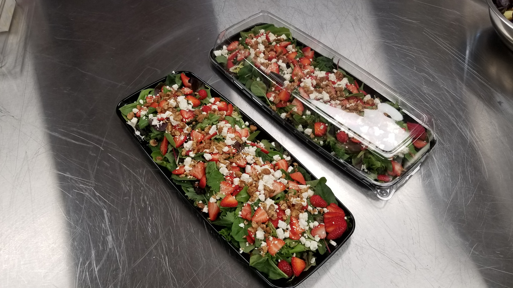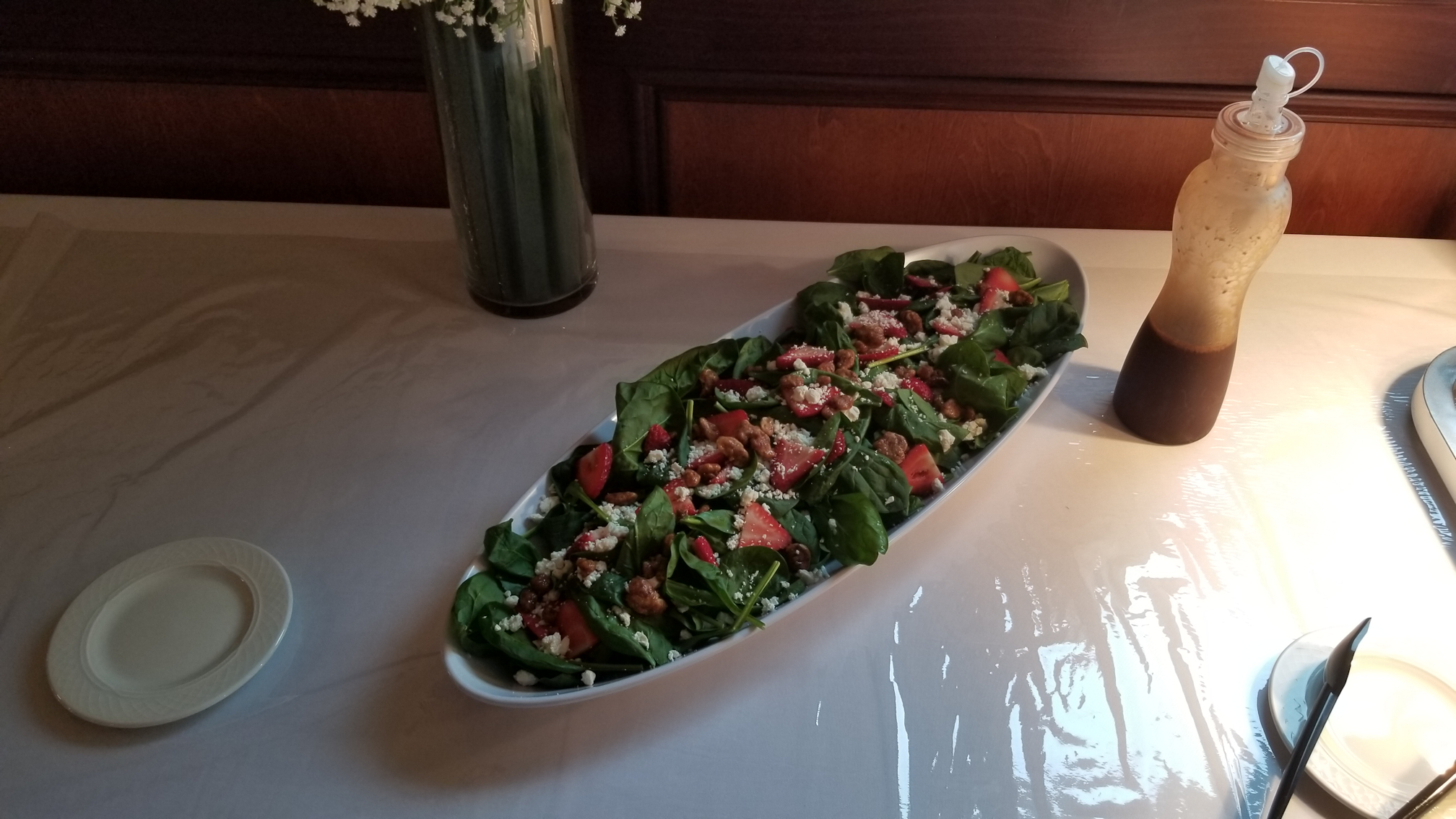 Spinach, strawberries, candied walnuts, feta, with fig balsamic vinaigrette dressing.
