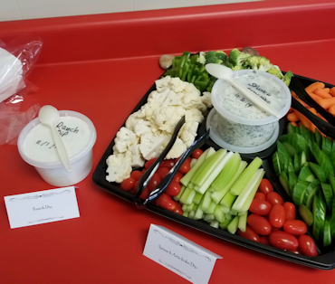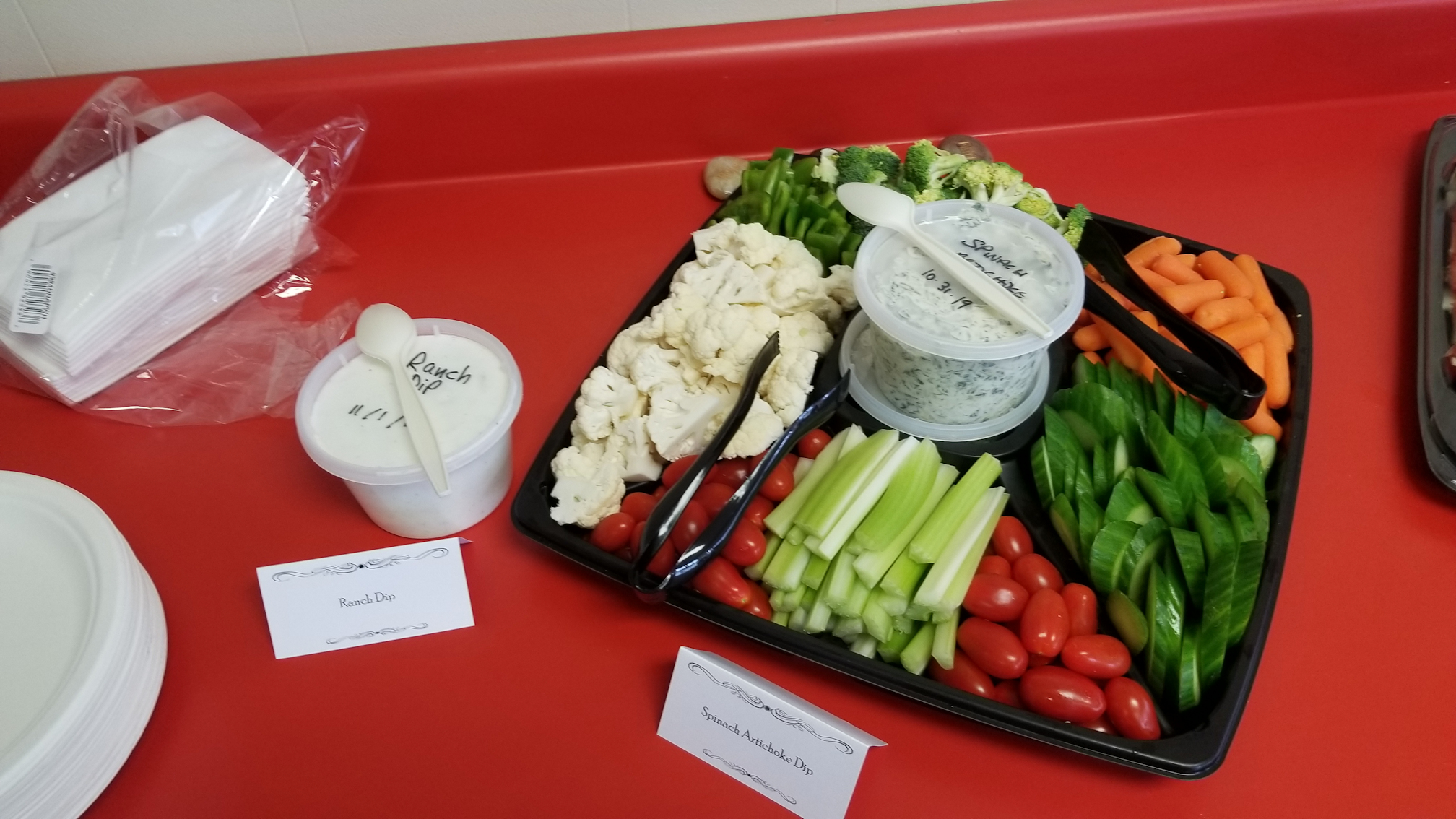 Bountiful veggie selection with ranch and spinach artichoke dips.